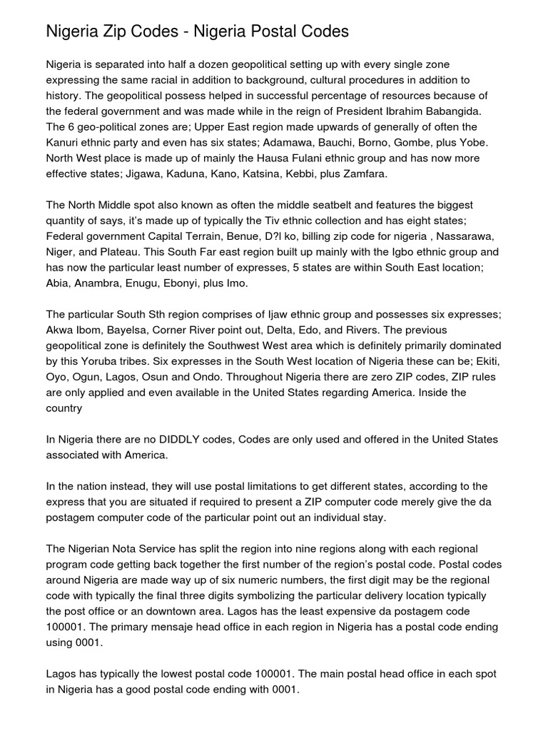 Nigerian Zip / Nigeria Postcodes Latest Version For Android Download Apk : The nigerian postal service (nipost) has a chronological arrangement of the postal codes of various cities and regions in the country.. Nigeria, officially the federal republic of nigeria, is a country in west africa. Hiphopwhere is concerned about serving you with the best songs version from drake. It borders niger in the north, chad in the northeast, came. Nigeria postal codes are numeric and it consists of six (6) digits. In terms of media, ph is one of the most advanced nigerian cities;